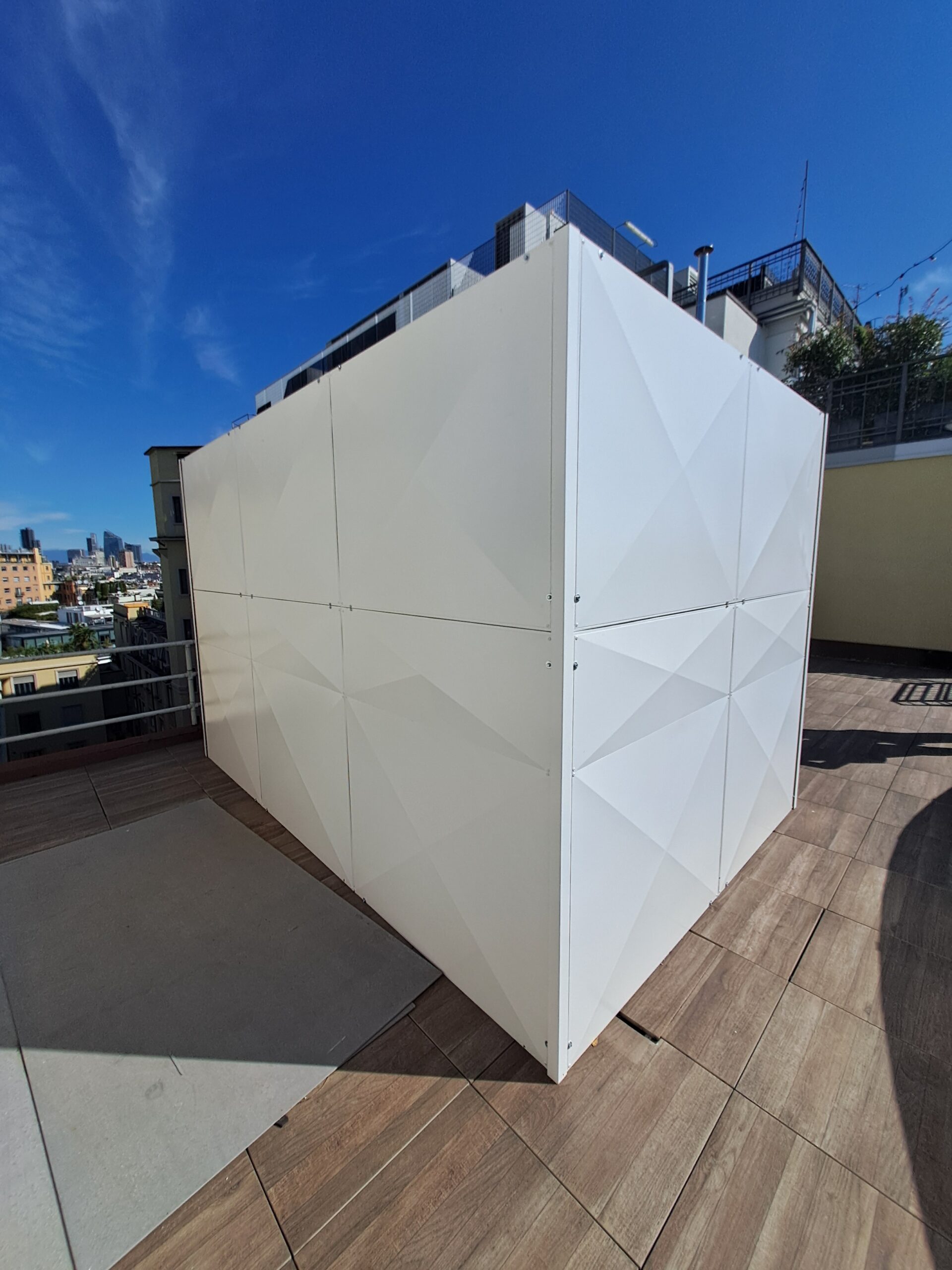 Abbiamo recentemente completato un intervento di sostituzione e nuova installazione di una cabina acustica posizionata sulla terrazza del penultimo piano dell’iH Hotel Ambasciatori di Milano. Siamo stati chiamati a risolvere la problematica del rumore generato da 2 impianti VRF e una pompa di calore di piccola dimensione, infastidendo gli ospiti delle camere affacciate e i residenti del vicinato.